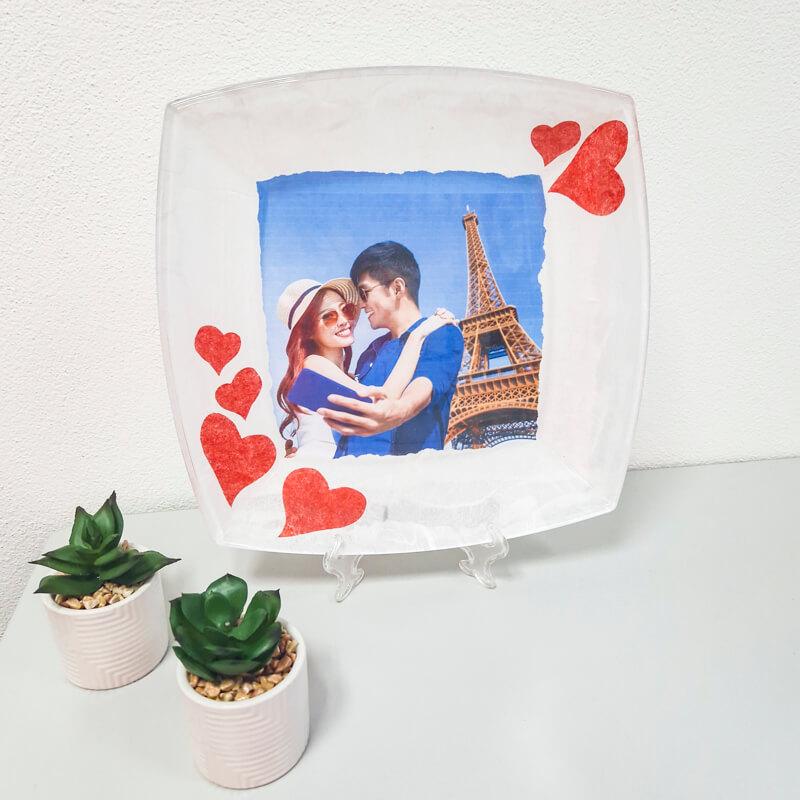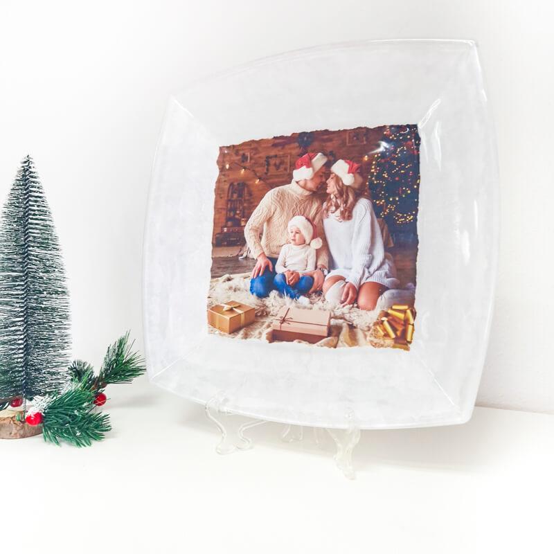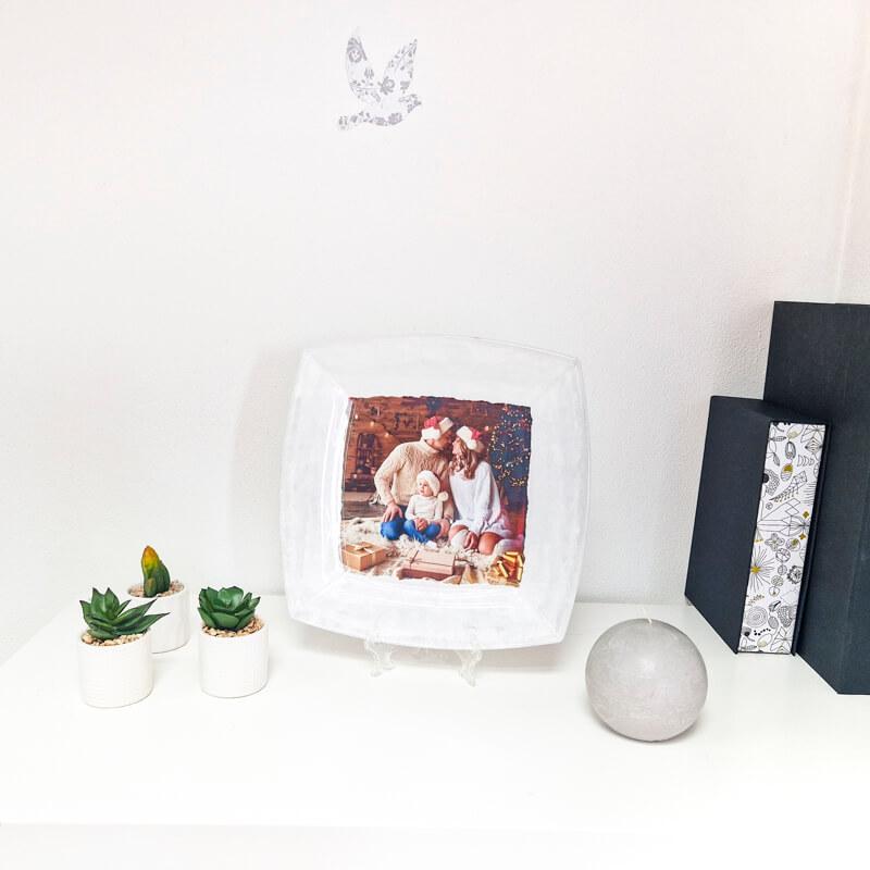 Steklen krožnik, obdelan v decoupage tehniki. Vi nam pošljete vašo fotografijo, mi vam jo obdelamo na krožnik. Personaliziran unikaten krožnik, ki bo ostal v trajen spomin.